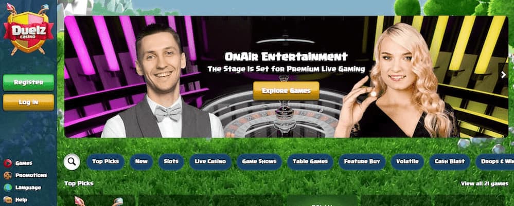 Duelz Casino is among the gambling platforms in this list that offer no-deposit bets. The best is provided as 100 free spins only applicable on its live roulette games at a rollover requirement of 10%.